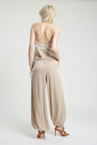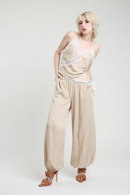 Pantalone Pinocchietto Stile Aladino in Viscosa Effetto Raso, Ampio a Palloncino con Elastici sul Fondo.