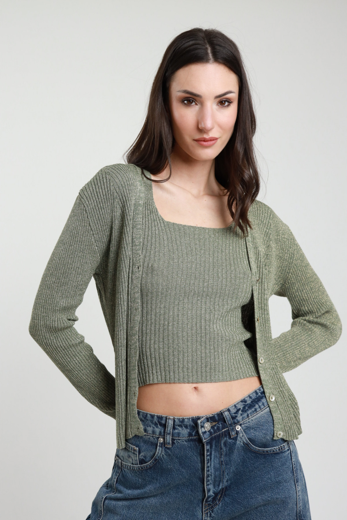 Gerippter Lurex-Cardigan mit Knopfverschluss. 90 %vi 8 %fm 2 %ea