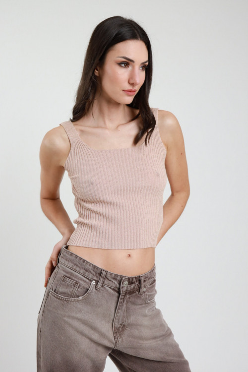 Geripptes Lurex-Crop-Top mit quadratischem Ausschnitt. 90 %vi 8 %fm 2 %ea