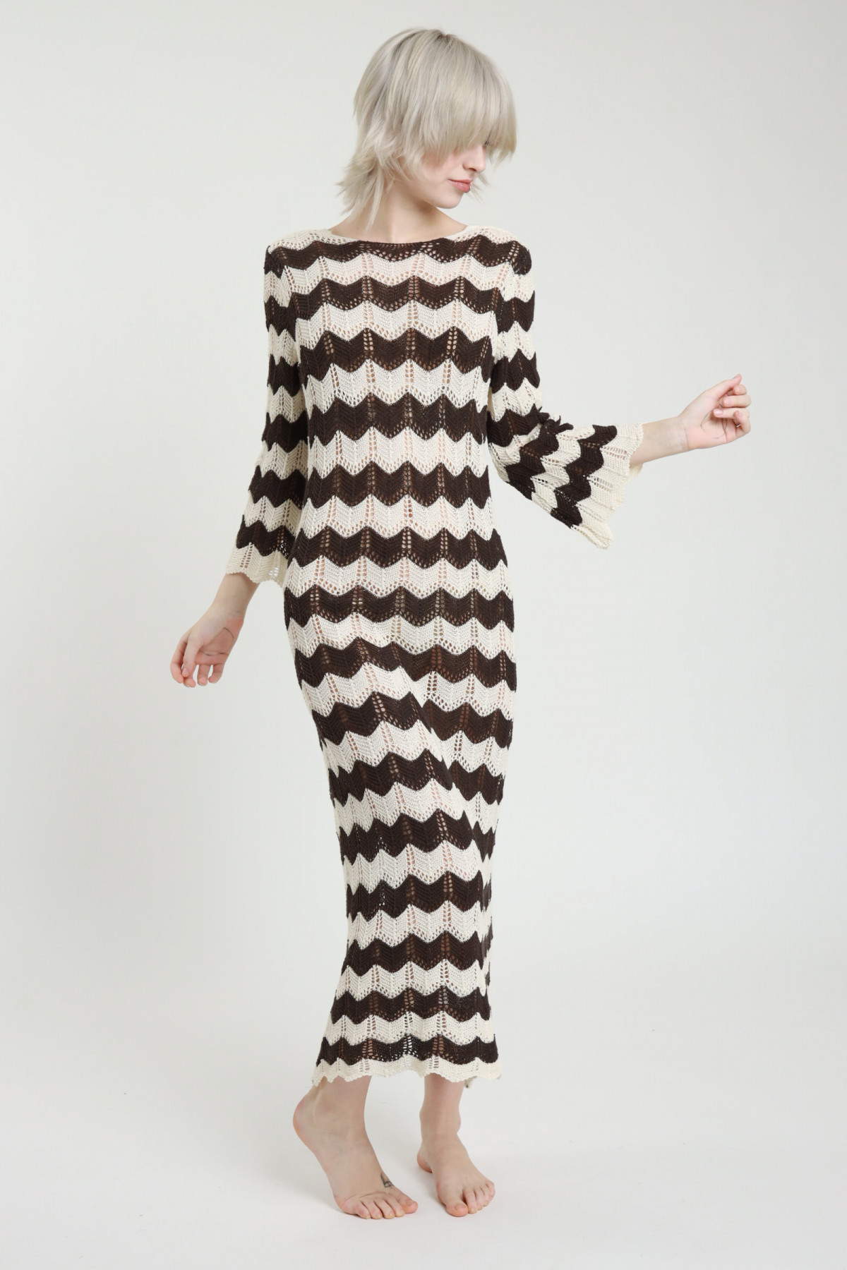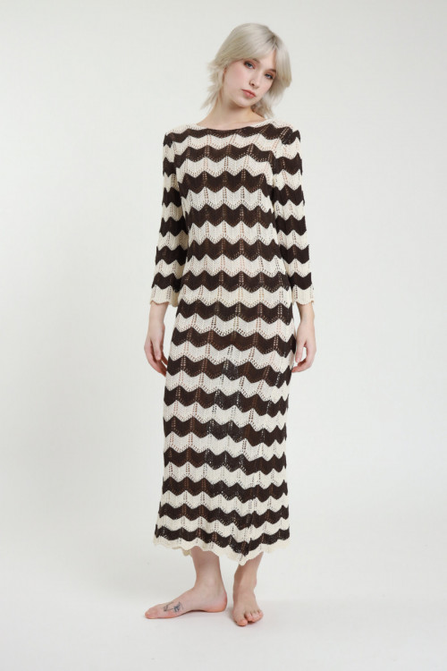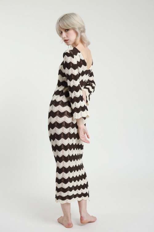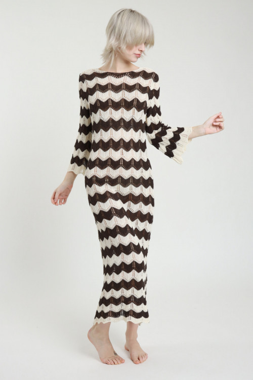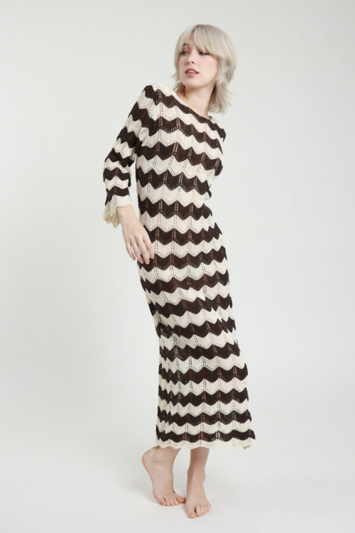 Langes Häkelkleid mit Zick-Zack-Streifen, 3/4-Glockenärmeln und weitem Ausschnitt am Rücken. 50 % CO 50 % AC