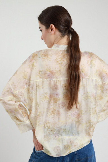 Halbtransparentes Hemd mit Blumenmuster und Stehkragen. 87 % bzw. 13 % pa