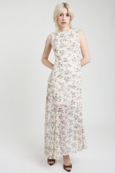 Abito Lungo in Raso con Scollo in Pizzo e Imbottitura sul Seno.