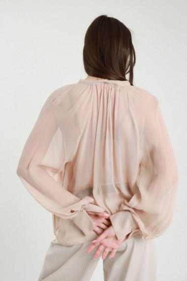 Halbtransparentes Hemd aus Viskose-Georgette mit Puffärmeln, Stehkragen mit Spitze. 100 % vi