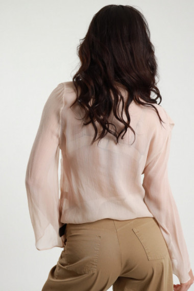 Halbtransparente Crop-Bluse mit Spitze am Saum, Ballonärmel mit Gummizug an den Handgelenken, V-Ausschnitt. 85 % 15 % pl