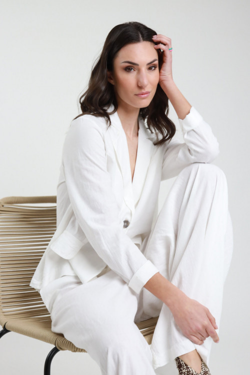 Weite Palazzo-Hose, elastischer Bund mit Kordelzug, Portemonnaietaschen vorne und große quadratische Taschen hinten. 55 %li 45 %vi