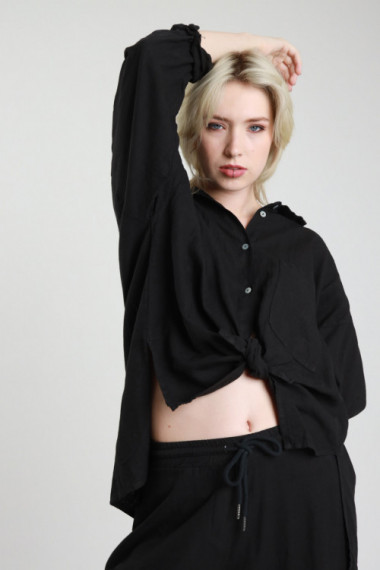 Übergroßes Hemd mit überschnittener Schulter, großer Tasche vorne und langen Ärmeln. 55 %li 45 %vi