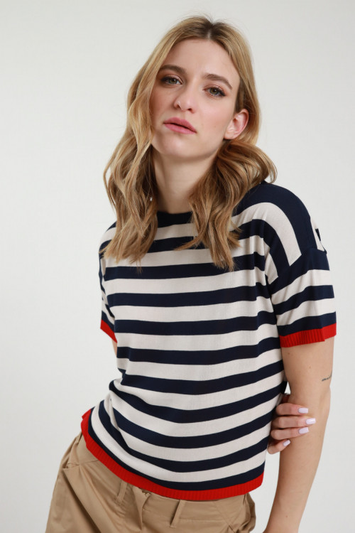 Gestreiftes Boots-T-Shirt mit kontrastierenden Ärmelkanten und Saum. 100 % vi