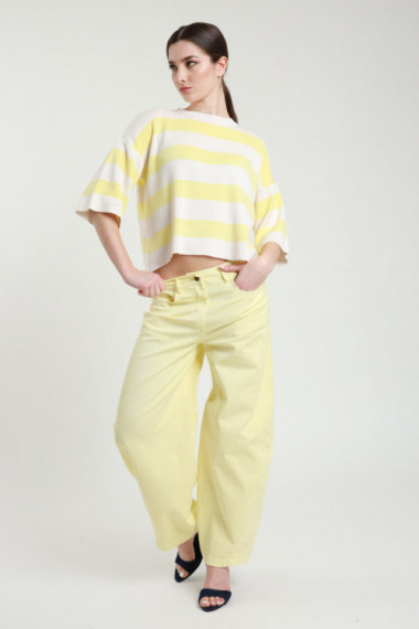 Palazzo Trousers With Pleats On The Front. Seamless waist, zip on the side, incorporated belt. 78%pl 18%vi 4%ea