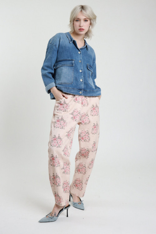 Bull Denim-Hose mit Blumendruck, elastischem Bund und Taschen vorne. Übergroßer Schnitt. 98 % CO 2 % Stück