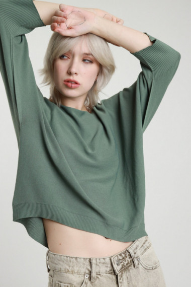 Maglia in Viscosa con Scollo a Barchetta, Maniche Raglan a 3/4, Effetto Slavato.