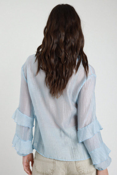 Semi-transparent Shirt in Polka Dot Pattern with Frills on 3/4 Sleeves, Korean Collar and Removable Knot. 87%ly 13%pa