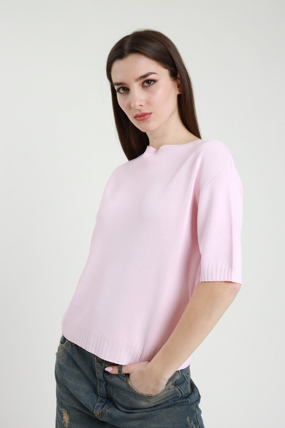 Maglia Giorocollo Maniche Corte con Spalline Imbottite, Bordi a Costine.