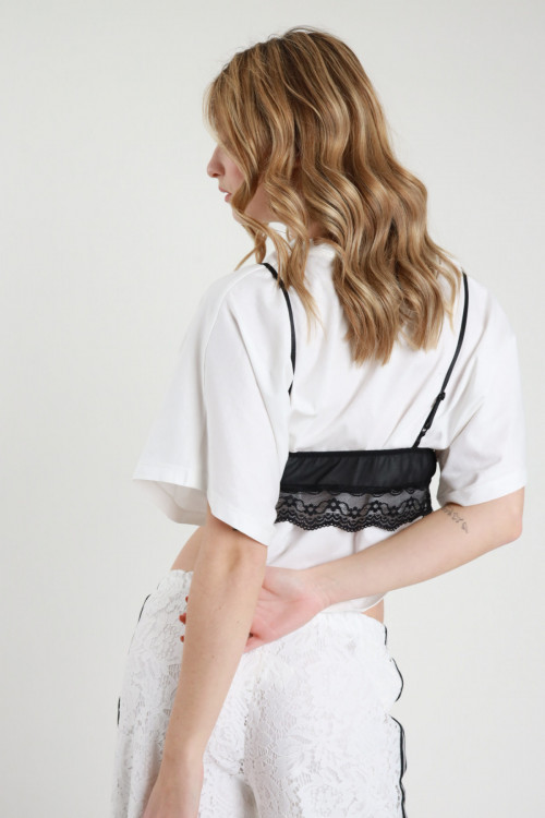 T-Shirt Crop Girocollo Asimmetrica con Maniche Ampie + Top con Bordi in Pizzo Rimovibile.