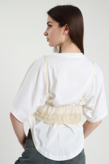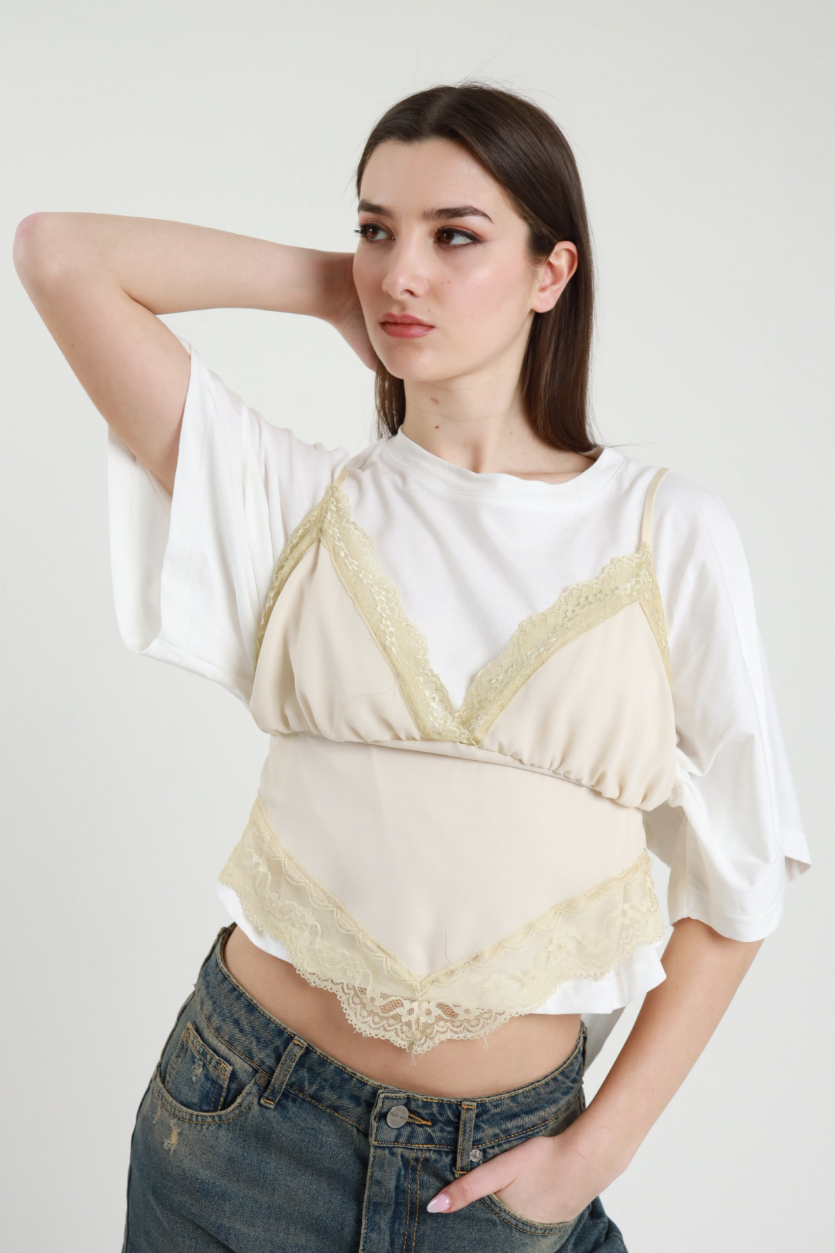 T-Shirt Crop Girocollo Asimmetrica con Maniche Ampie + Top con Bordi in Pizzo Rimovibile.