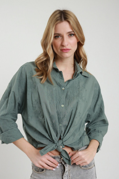 Halbtransparentes Hemd mit Blumenmuster und Stehkragen. 87 % bzw. 13 % pa