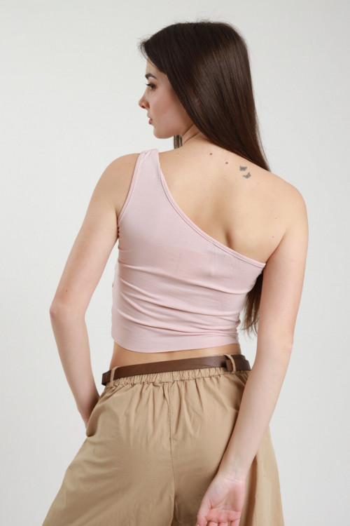 Asymmetrical Sleeveless Crop Top with Gather under the Breast and Lace Applied on the Armhole. 94%co 6%ea