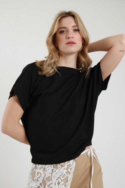 Short, half-sleeved cotton T-shirt with jewel crew neck and button on the back. 100%co