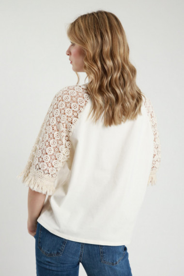 T-Shirt Girocollo con Inserto in Pizzo sul Fondo e sulle Maniche.