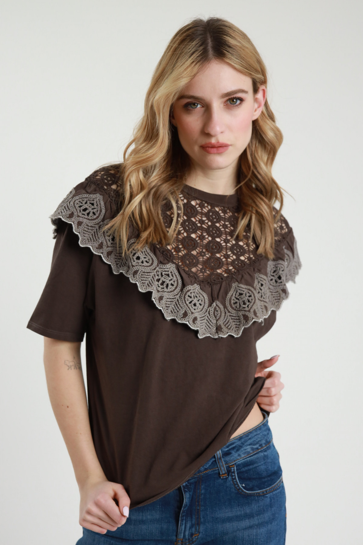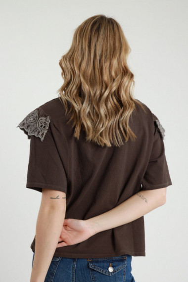 Asymmetrisches T-Shirt aus Stretch-Viskose mit goldenem Accessoire an der Schulter. 94 %vi 6 %ea