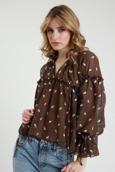 Embroidered half-sleeved blouse with ruffles and lace on the neckline, elastic under the bust and puffed sleeves. 49%ly 30%pl 21%pa