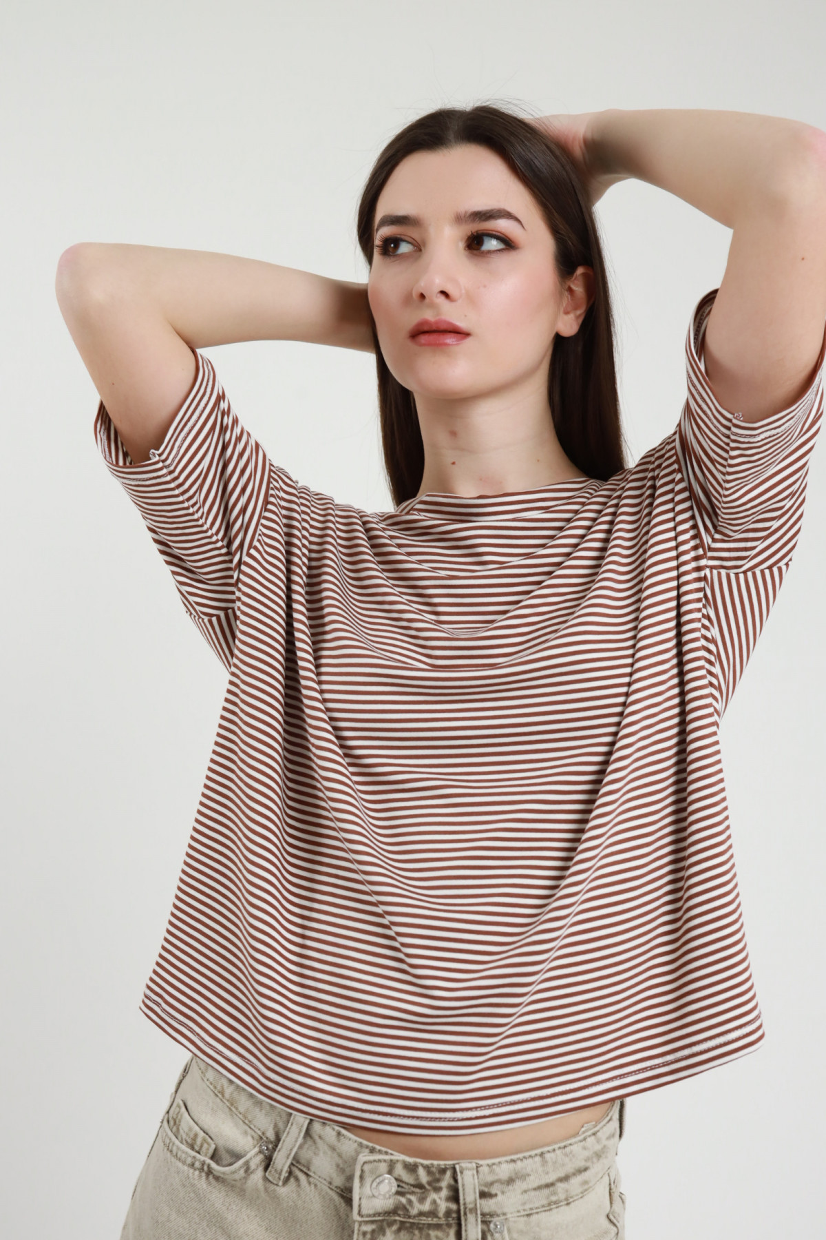 Crew-neck half-sleeved T-Shirt in stretch viscose, kimono model, in striped pattern. 94%vi 6%ea