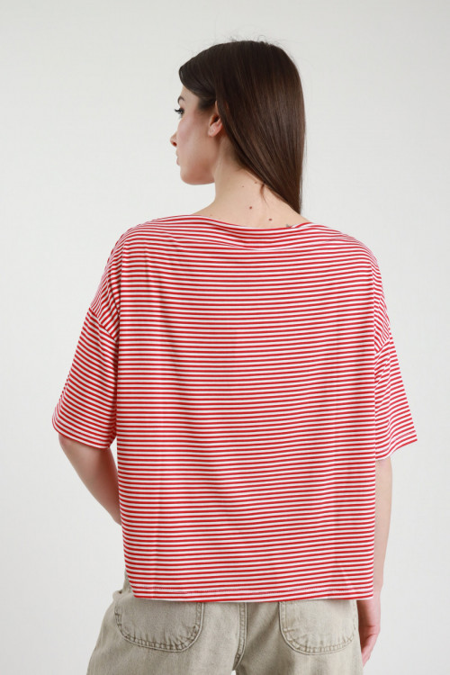 Crew-neck half-sleeved T-Shirt in stretch viscose, kimono model, in striped pattern. 94%vi 6%ea