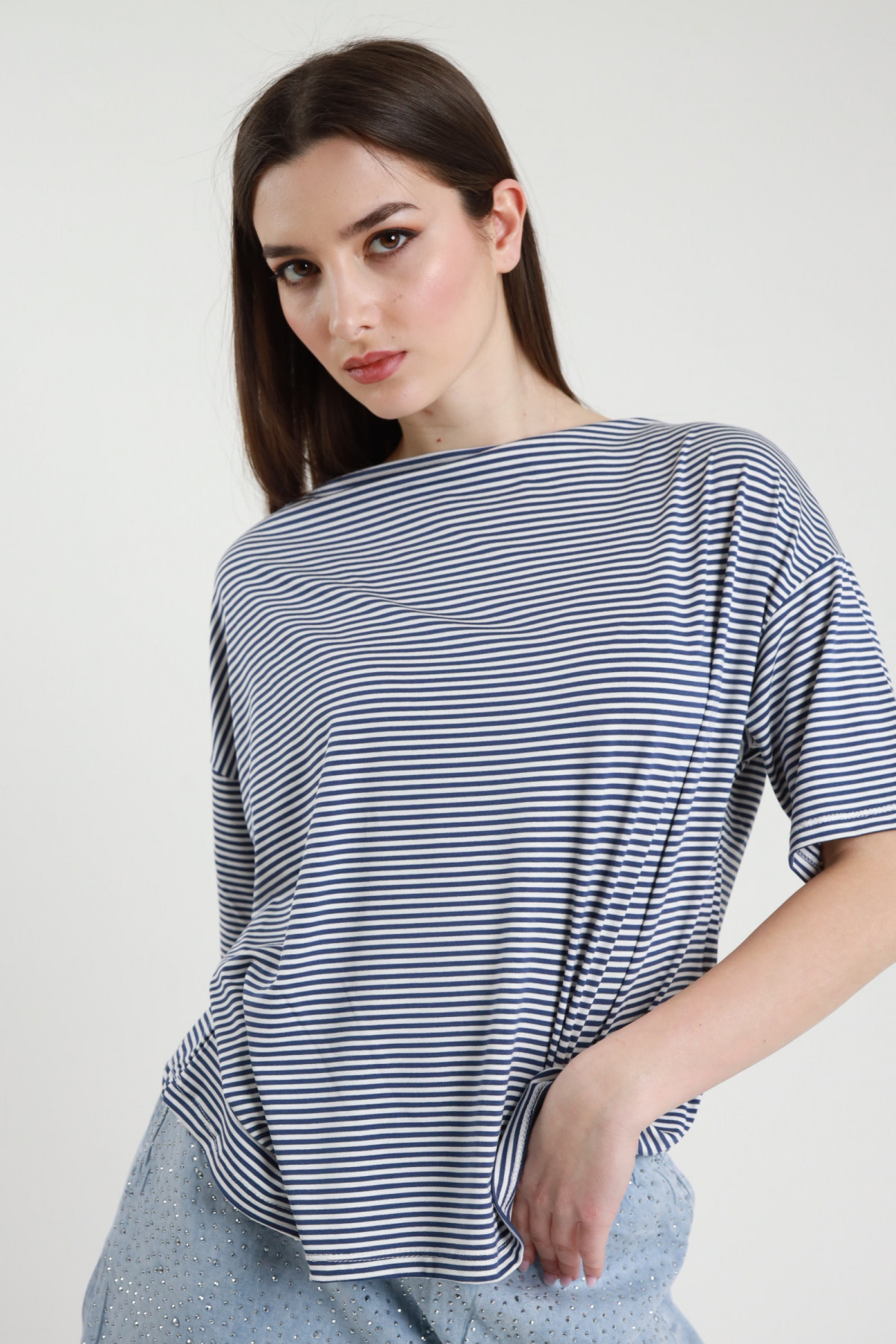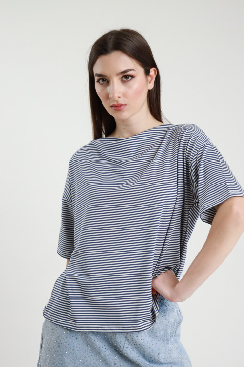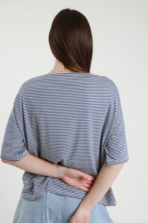 Crew-neck half-sleeved T-Shirt in stretch viscose, kimono model, in striped pattern. 94%vi 6%ea