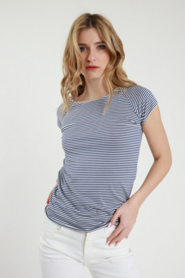 T-Shirt aus Stretch-Viskose mit U-Boot-Ausschnitt im Streifenmuster und Raglanärmeln. 95 %vi 5 %ea