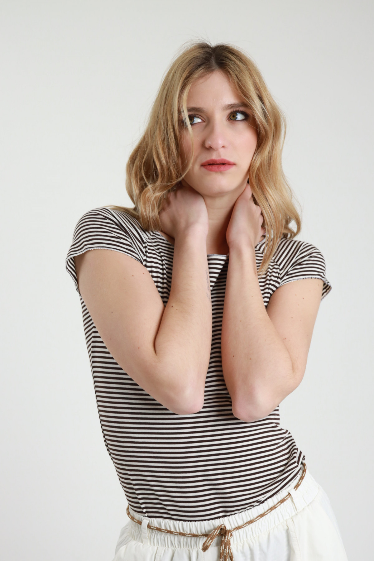 Asymmetrisches T-Shirt aus Stretch-Viskose mit goldenem Accessoire an der Schulter. 94 %vi 6 %ea