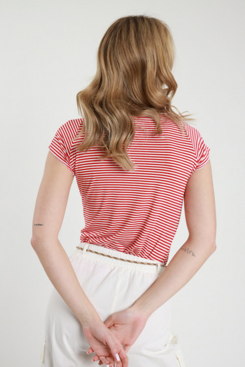 T-Shirt aus Stretch-Viskose mit U-Boot-Ausschnitt im Streifenmuster und Raglanärmeln. 95 %vi 5 %ea