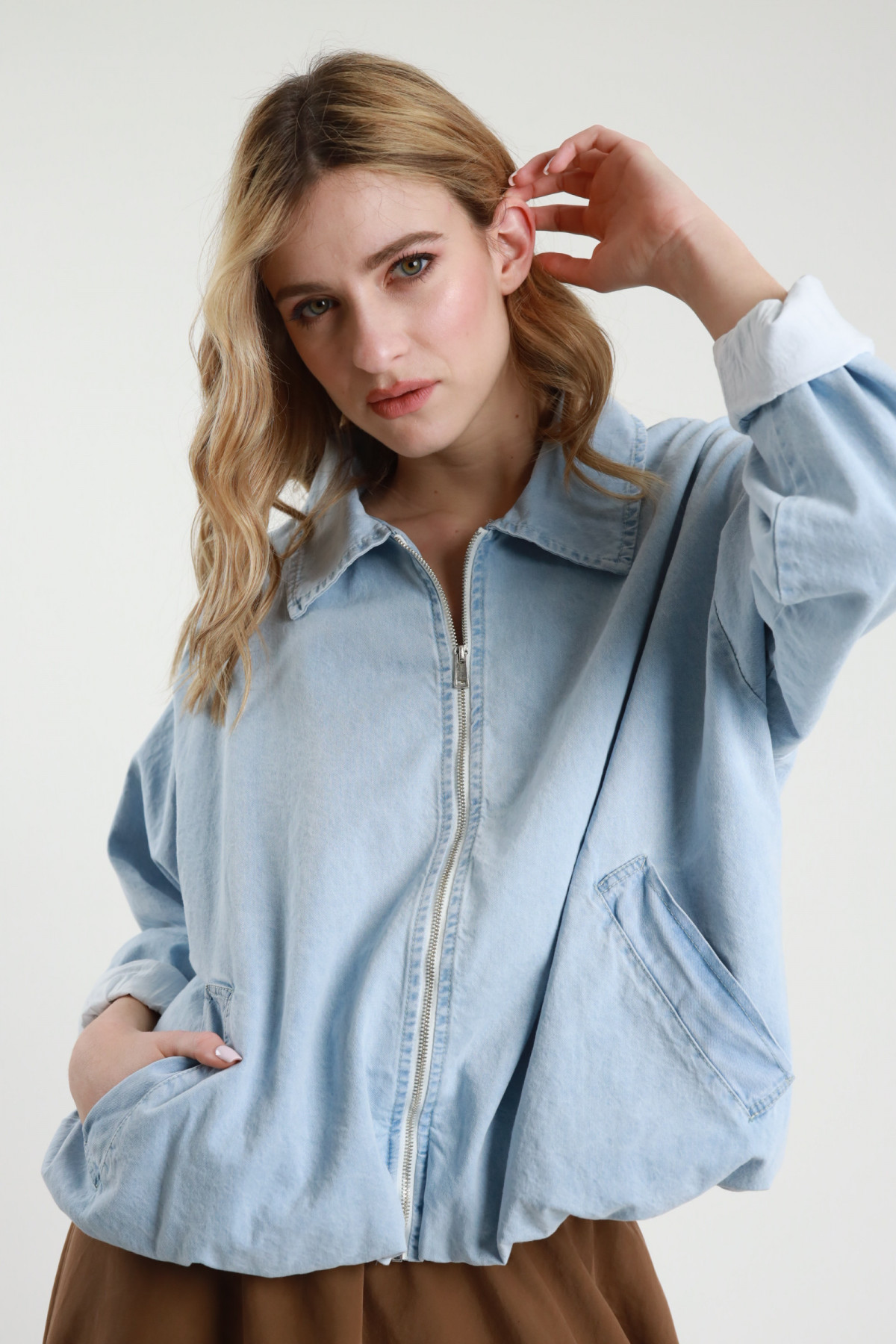 Giacca Camicia Taglio Over in Denim Lavaggio Colorato Marrone con Sbiaditure e Chiusura Bottoni. 100%co