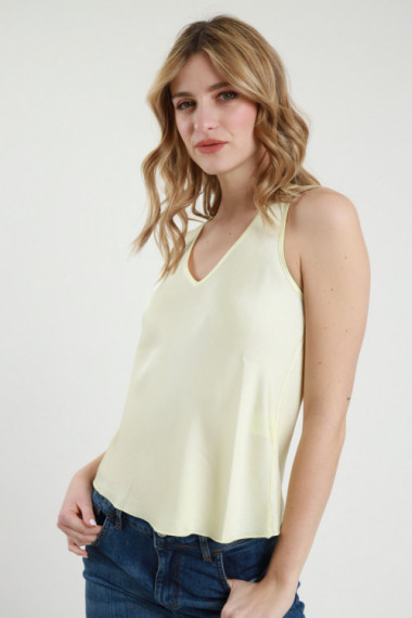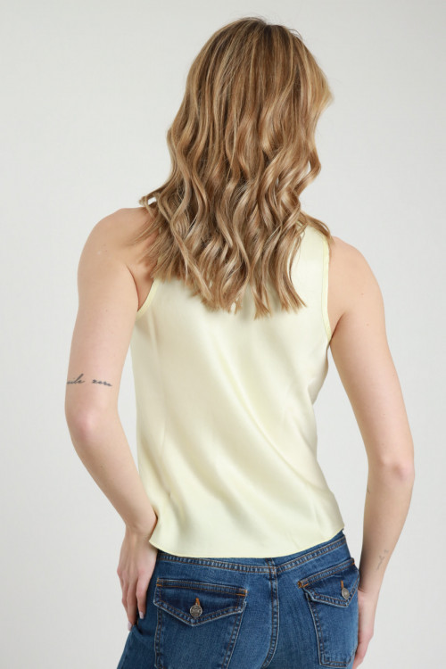 Asymmetrical Sleeveless Crop Top with Gather under the Breast and Lace Applied on the Armhole. 94%co 6%ea