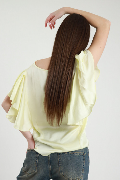 Semi-sheer Crop Blouse with Lace on the Bottom, Balloon Sleeves with Elastic on the Wrists, V-Neck. 85%ly 15%pl