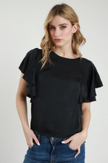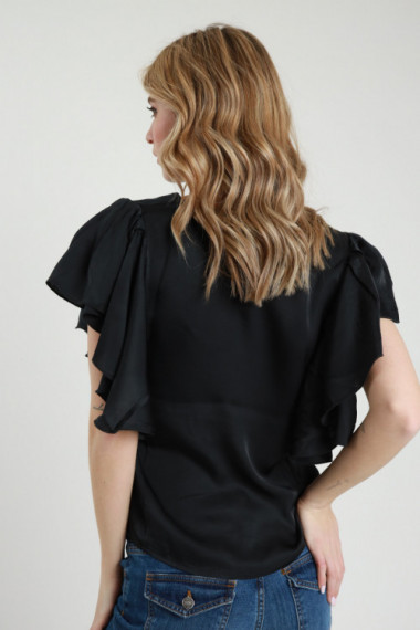 Embroidered half-sleeved blouse with ruffles and lace on the neckline, elastic under the bust and puffed sleeves. 49%ly 30%pl 21%pa