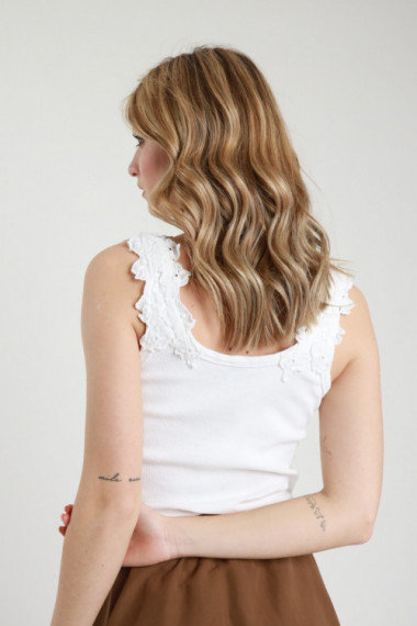 Ribbed tank top in stretch cotton, neckline in a little flower pattern. 95%co 5%ea