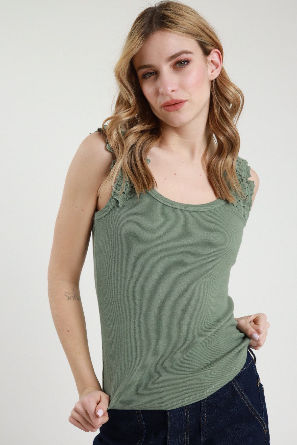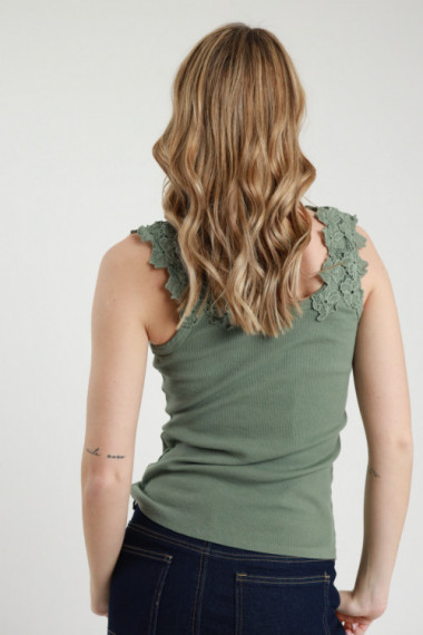 Ribbed tank top in stretch cotton, neckline in a little flower pattern. 95%co 5%ea