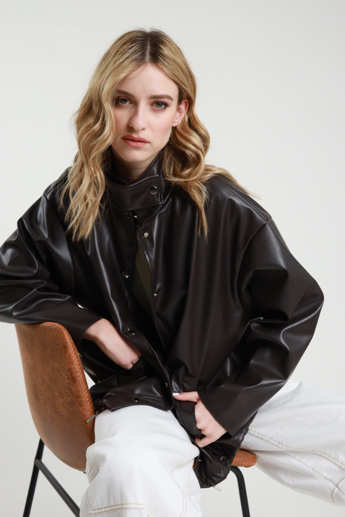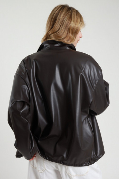 Bomber in Ecopelle con Colletto Camicia, Tasche Laterali con Pattina.
