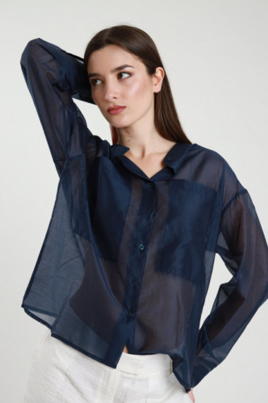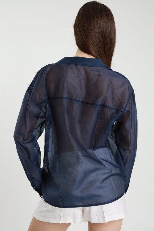 Camicia Georgette in Fantasia Denim Semitrasparente con Polsini Alti.