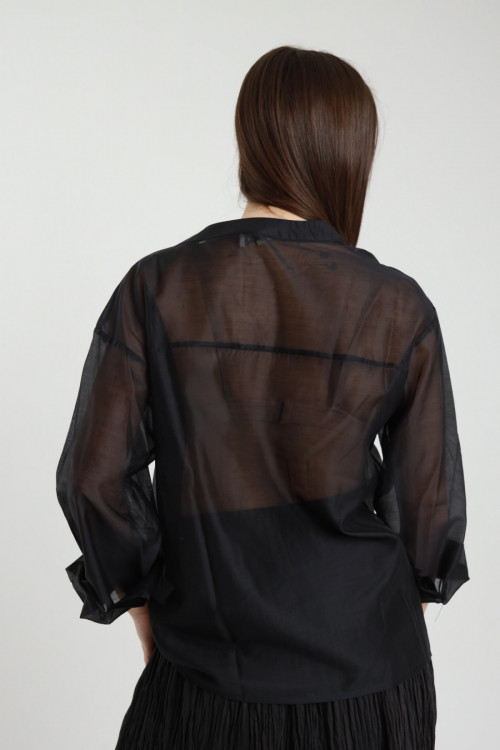 Camicia Semitrasparente in Georgette di Viscosa con Maniche a Sbuffo, Collo alla Coreana con Laccio.