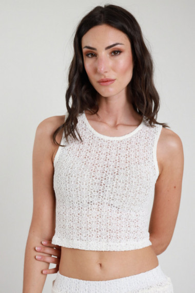 Top Crop Elasticizzato, Smanicato in Crochet Traforato. 99%pl 1%ea