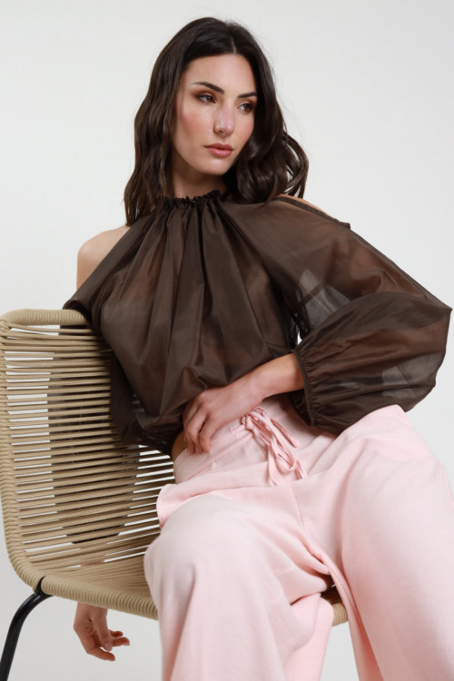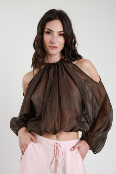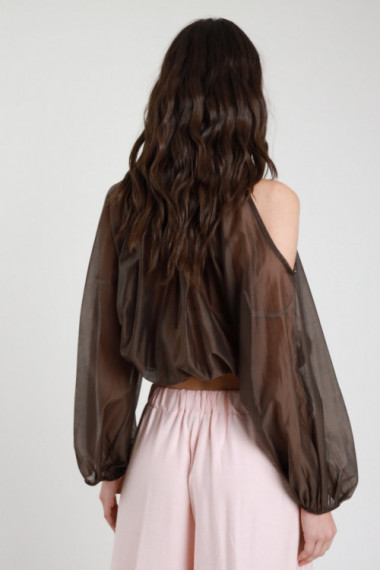 Semi-sheer Crop Blouse with Lace on the Bottom, Balloon Sleeves with Elastic on the Wrists, V-Neck. 85%ly 15%pl