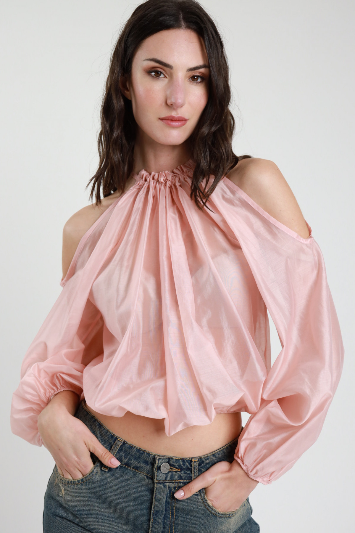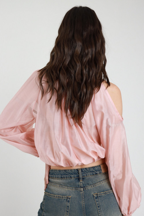 Semi-sheer Crop Blouse with Lace on the Bottom, Balloon Sleeves with Elastic on the Wrists, V-Neck. 85%ly 15%pl