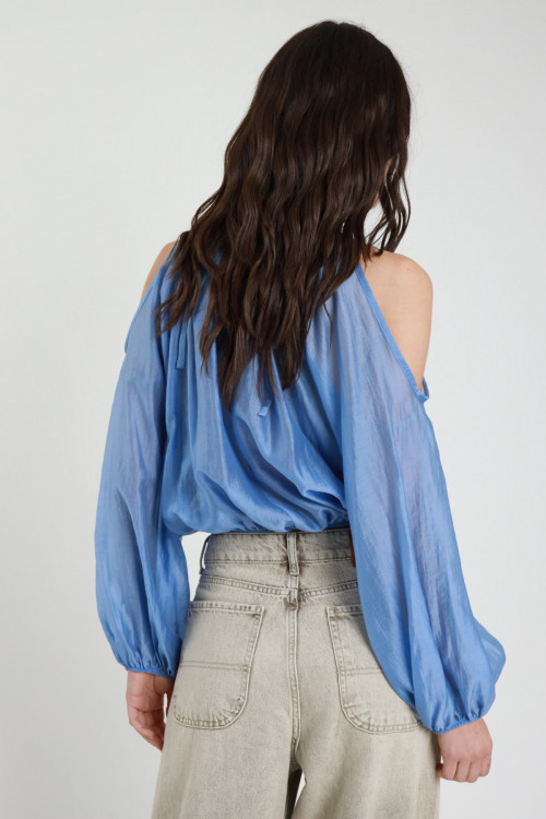Semi-sheer Crop Blouse with Lace on the Bottom, Balloon Sleeves with Elastic on the Wrists, V-Neck. 85%ly 15%pl