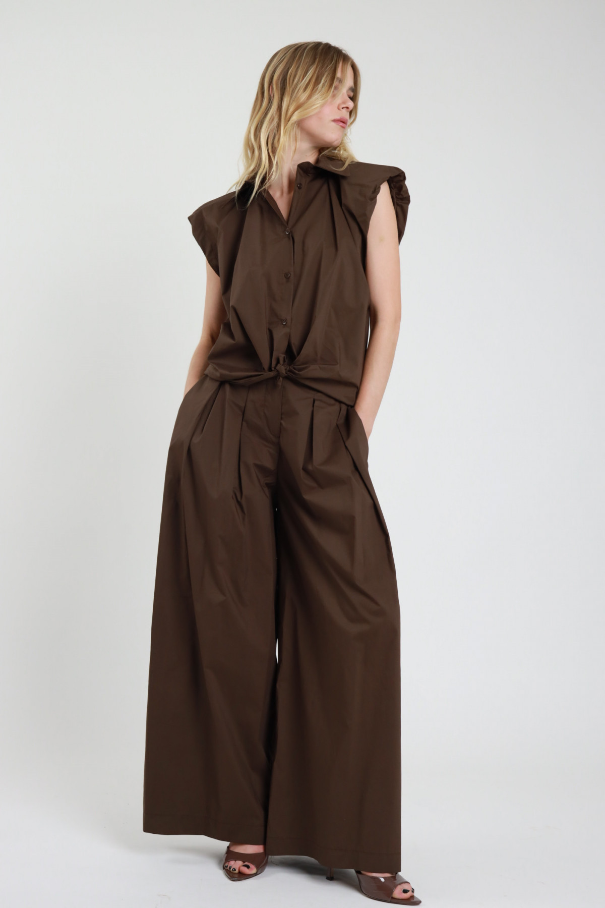 Completo: Camicia Crop Con Bottoni A Scomparsa e Pantaloni A Gamba Dritta Con Tasche A Portafogli e Doppio Bottone In Vita. 80%vi 20%li