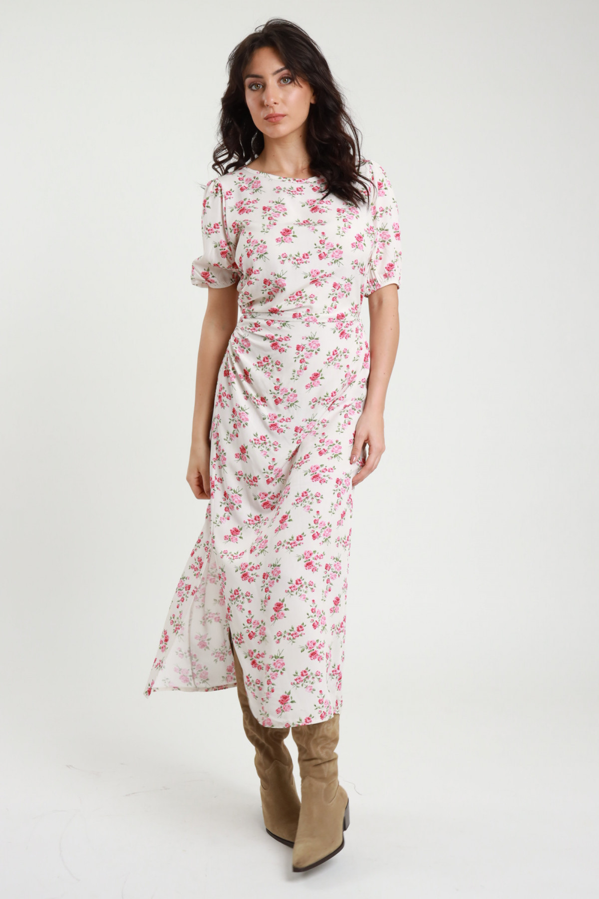 Abito A Manica Lunga Con Anello Centrale Bucato e Arricciature. Taglio Midi.