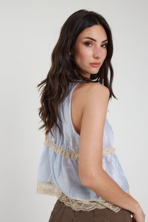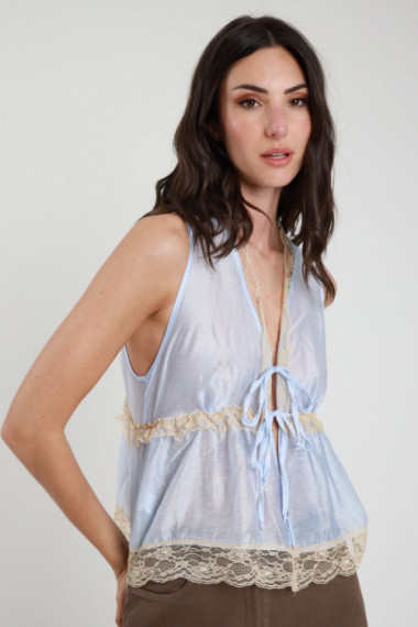 Tanktop mit Stickerei, Verschluss vorne mit Schnürsenkeln, Stickerei unten. 75%ly 18%ny 7%li