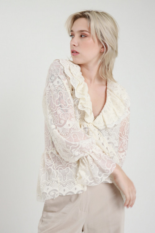 Halbtransparente Crop-Bluse mit Spitze am Saum, Ballonärmel mit Gummizug an den Handgelenken, V-Ausschnitt. 85 % 15 % pl