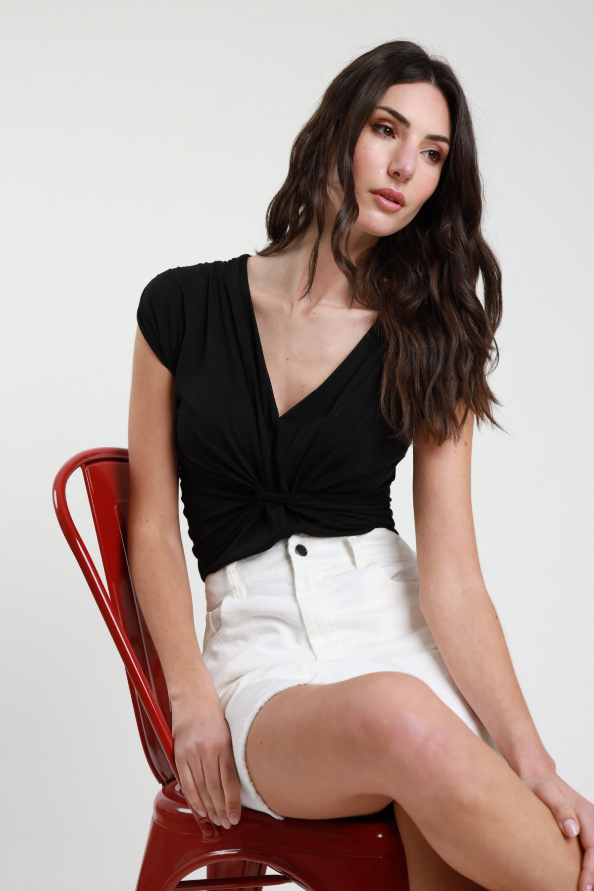 Asymmetrisches T-Shirt aus Stretch-Viskose mit goldenem Accessoire an der Schulter. 94 %vi 6 %ea