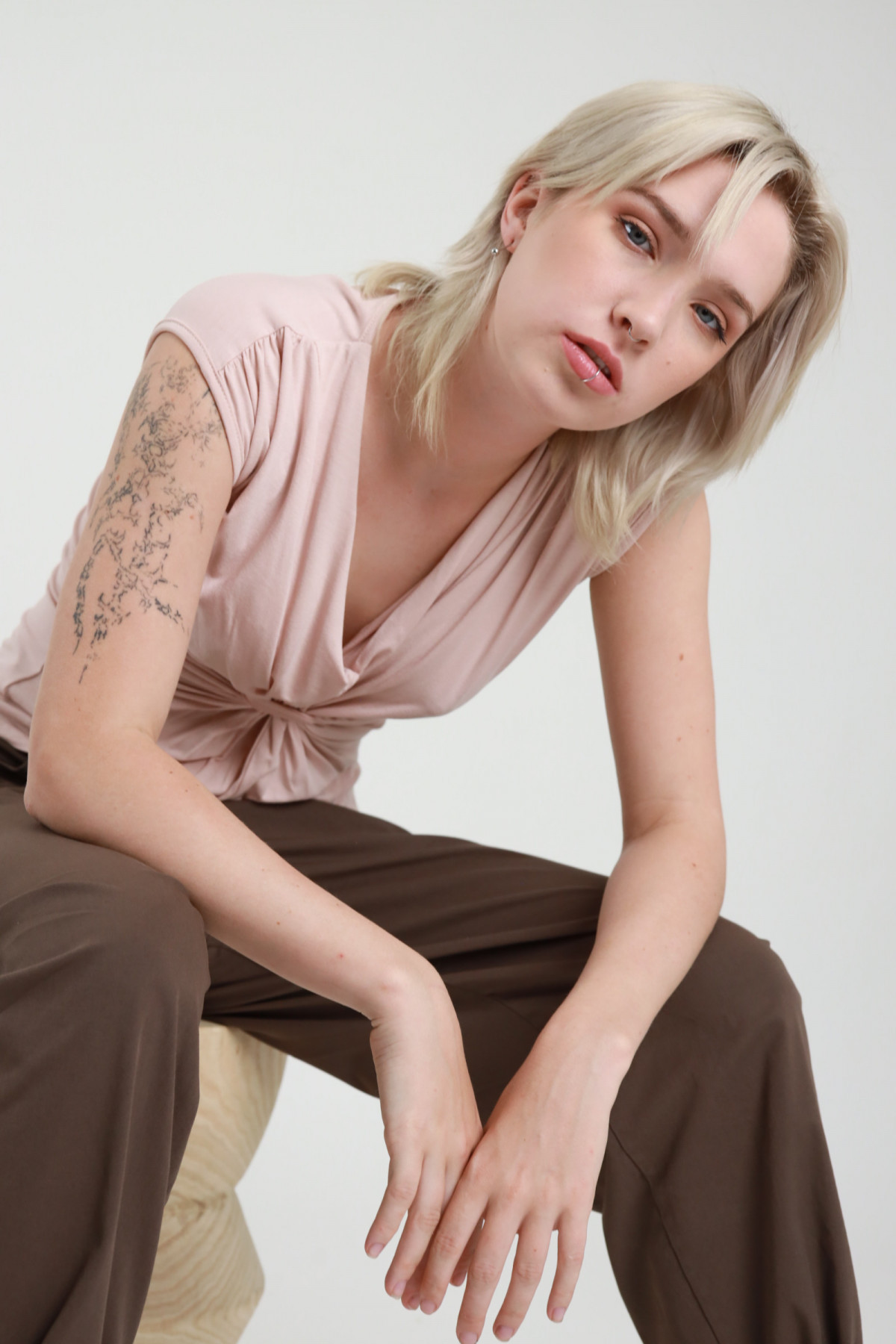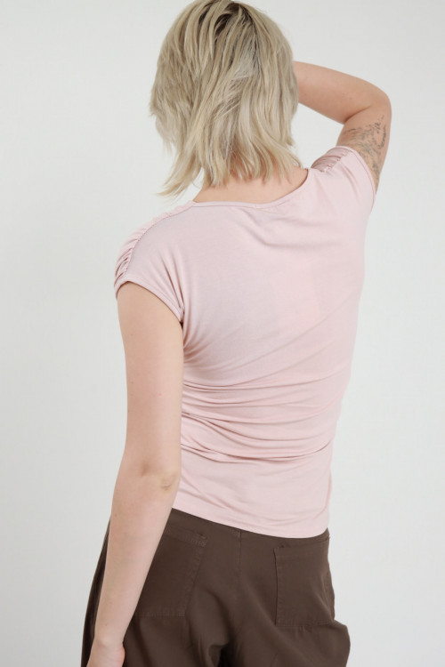 Asymmetrisches T-Shirt aus Stretch-Viskose mit goldenem Accessoire an der Schulter. 94 %vi 6 %ea