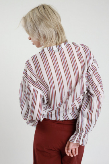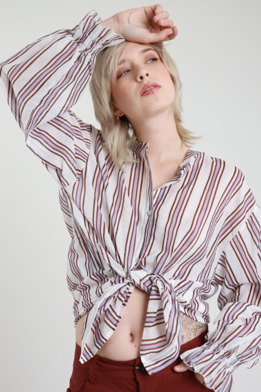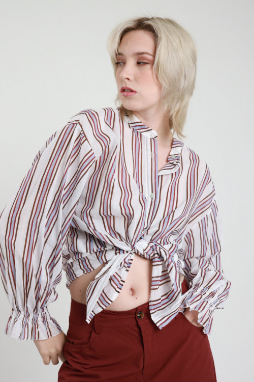 Nadelstreifen-Baumwollhemd mit Puffärmeln, elastischen Bündchen, abnehmbarem Knoten und Stehkragen. 100 % co